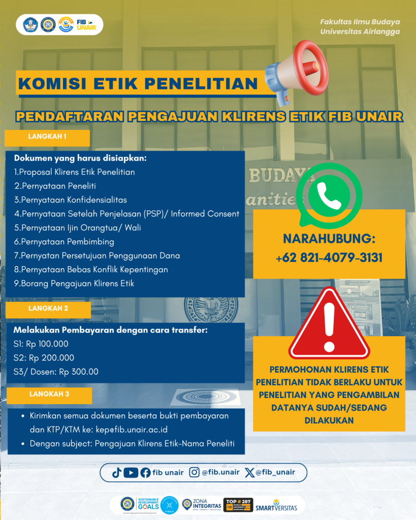 Komisi Etik Penelitian Fakultas Ilmu Budaya Universitas Airlangga membuka pendaftaran pengajuan Klirens Etik. Bagi peneliti yang akan mengajukan, berikut langkah yang perlu dilakukan: